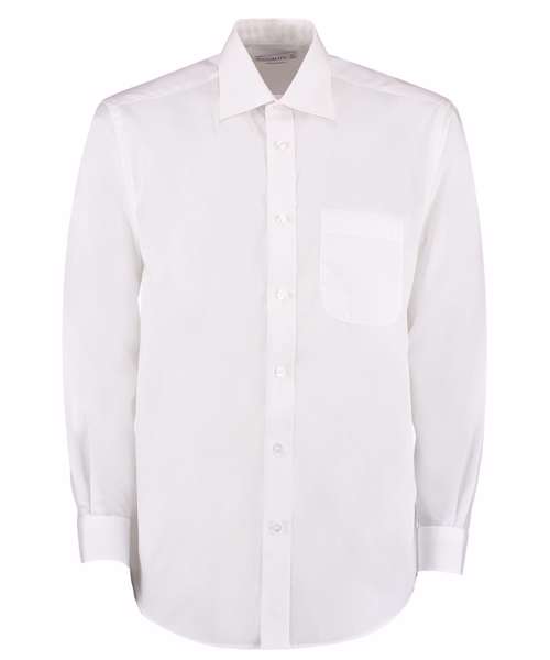Fused stand-up collar. Double-stitched sleeve and side seams. Single needle stitched yoke, cuffs and armholes. Rounded hem. Chest pocket to left side as worn. 1-button adjustable cuff with no button cuff placket. Spare button. Kustom Kit® woven back neck label.